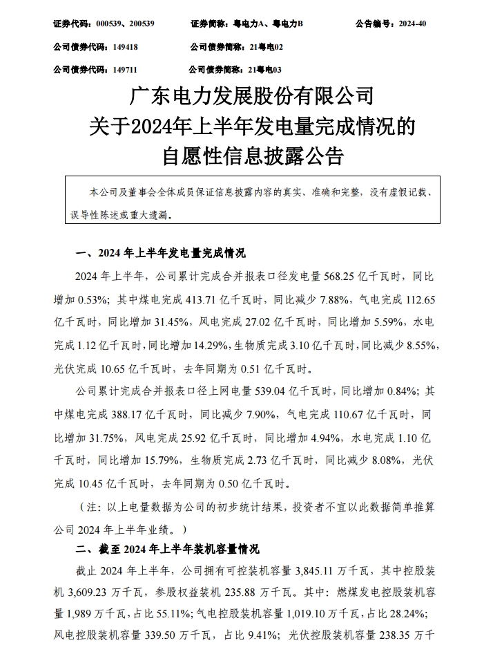 近日,粤电力A发布广东电力发展股份有限公司关于2024年上半年发电量完成情况的自愿性信息披露公告。