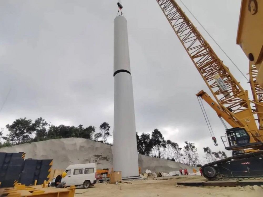 该项目位于辽宁省鞍山市岫岩满族自治县境内,属于山地风电场,海拔高程在200-500米间。该项目拟安装单机容量6.25兆瓦机型风电机组16台,其中6台为五段式塔筒,塔筒总高为122.3米,单套重量约为366.238吨;10台为六段式塔筒,塔筒总高为127.3米,单套重量约为413.728吨,总工程量为6334.708吨,此次吊装的塔筒为5段式125米型塔筒。