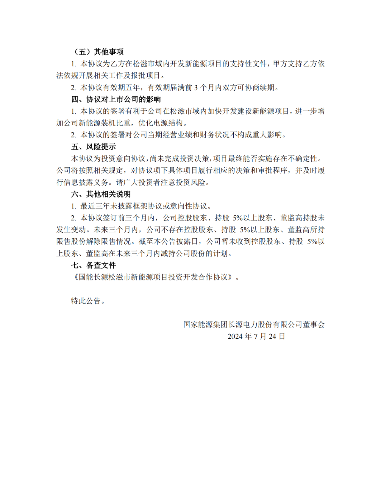 公告称,2024年7月20日,湖北省松滋市人民政府与长源电力签署了《国能长源松滋市新能源项目投资开发合作协议》。合作内容包括,双方在松滋市域内合作开发建设的新能源项目总装机规模不少于150万千瓦(其中风电不少于65万千瓦),项目总投资约70亿元。