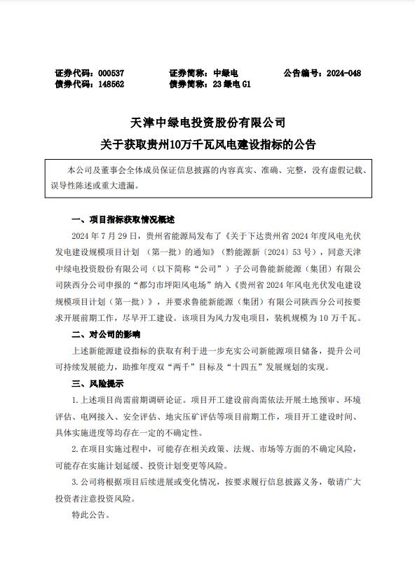 7月31日,天津中绿电投资股份有限公司(简称:中绿电)发布关于获取贵州10万千瓦风电建设指标的公告。