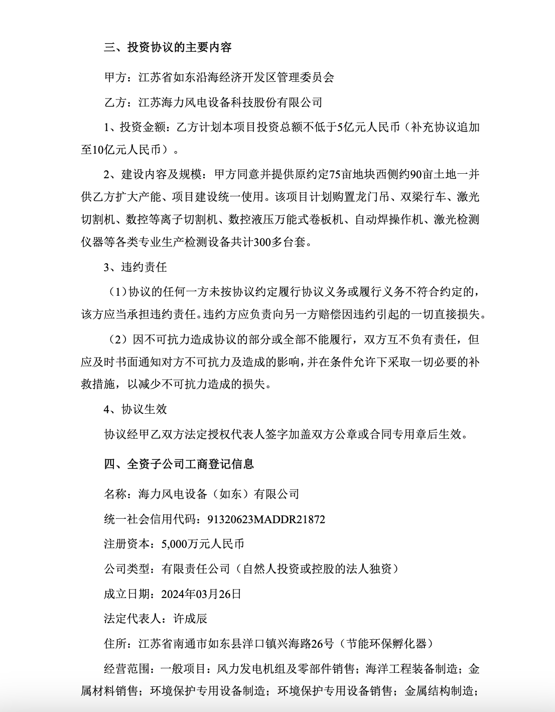 《公告》显示,海力风电和江苏省如东沿海经济开发区管理委员会签署《补充协议书》,经双方友好协商,就《<海力高端能源装备制造项目>项目建设协议书》的未尽事宜达成补充协议:江苏省如东沿海经济开发区管理委员会同意并提供原约定75亩地块西侧约90亩土地一并供海力风电扩大产能、项目建设统一使用;海力风电同意将项目总投资由5亿元人民币提升至10亿元人民币。