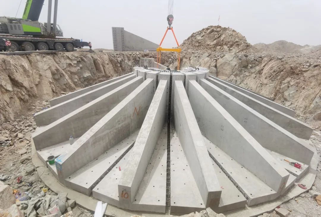 预制装配梁板式风机基础项目是中船风电和中船海装联合开展的重点研发项目,聚焦当前风电项目建设中普遍存在的冬季施工困难、基础养护周期长、施工成本高、施工质量难以把控等问题,创新采用化整为零、预制装配的作业模式,将传统模式下风机基础现场一体浇筑变为多个扇形部件预制化生产、批次施工、环形定位安装,攻克了预制基础吊装平稳度、多片预制构件拼装同心度、高效率作业下保持灌浆密实度等技术难题,具有工序简单、节约工期、基础免养护、基础二次利用、冬季施工等优点。运用预制装配梁板式风机基础,高台北部滩风电项目工期可由39天降低至12天,单台基础混凝土和钢筋量可节省20%以上,充分展现出广阔的应用前景,成为中船风电和中船海装在推进创新引领和新技术转化运用上的又一标志性成果。
