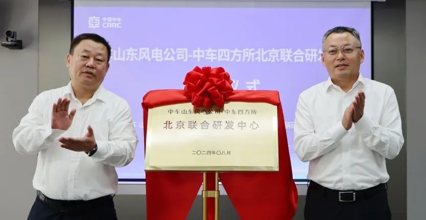 8月8日,中车山东风电公司-中车四方所北京联合研发中心揭牌仪式在北京隆重举行。中车四方所党委书记、董事长孔军,中车山东风电公司党委书记、董事长李广伟,中车四方所副总经理崔凤钊,中车山东风电公司总经理助理、研究院院长唐晶以及双方相关单位负责人参加揭牌仪式。