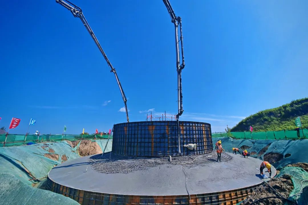首台风机基座位于位于江湾镇华东村。作为风电工程的最关键部分,本风机基座设计为圆盘式钢筋混凝土基座,单个基座直径23米、高度5.1米、中墩直径13米,混凝土950立方米,为大体积混凝土,存在浇筑施工组织复杂、协调工作量大、浇筑质量要求高等特点。