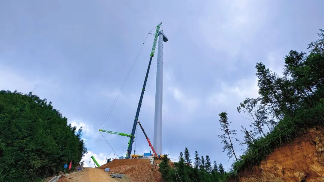 8月8日,中国水电四局云南分公司承制的申能贵州罗甸大亭风电场项目首套塔筒顺利吊装。