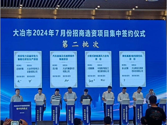 7月30日,湖北省大冶市人民政府与中海海洋建设工程发展有限公司就大箕铺镇分散式风力发电试点项目举行战略合作协议签约仪式,项目总投资12亿,装机容量240兆瓦。市委常委、大冶市委书记郝胜勇出席签约仪式并讲话,大冶市委副书记、市长孙辄主持仪式并致辞。
