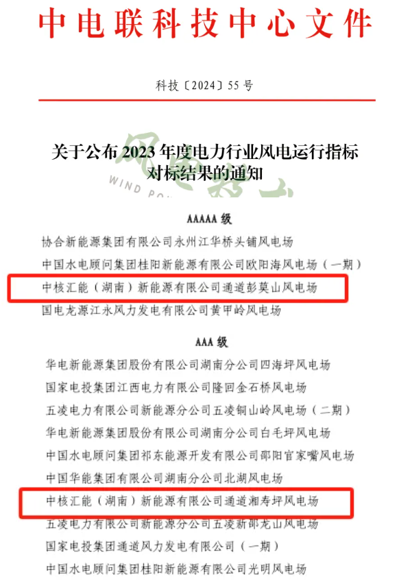 本次评选是由中国电力企业联合会科技开发服务中心组织,对52家发电集团(投资)公司所属3430家风电场电量指标和设备运行水平指标进行综合评价、公示、核实及最终评审,评选出全国各地区优胜风电场。在激烈竞争中,彭莫山风电场脱颖而出,成为此次中核集团两个5A级优胜风电场之一,湘寿坪风电场则继2021年成功对标后再度摘得3A级桂冠。