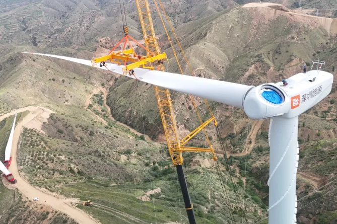 8月13日,在山西省大同市,随着风电机组第3支叶片在115米高空实现精准对接,天镇深能10万千瓦风电项目首台风机吊装工作顺利完成,标志着该项目全面进入风机设备安装阶段,为推动项目如期并网投产奠定了坚实基础。