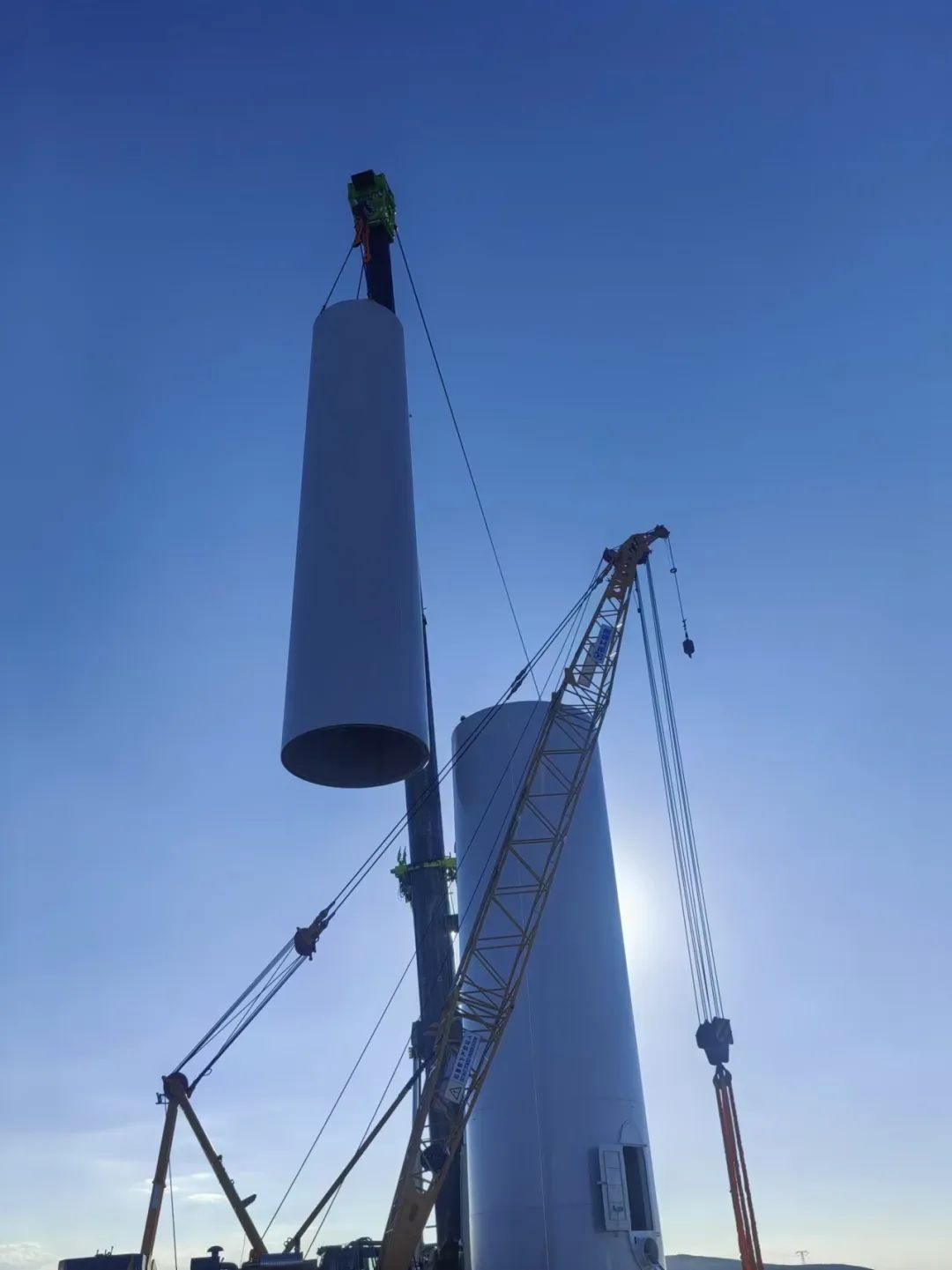 8月20日,新疆分公司承制的木垒东新新能源风电塔筒制作项目首套塔筒顺利吊装。