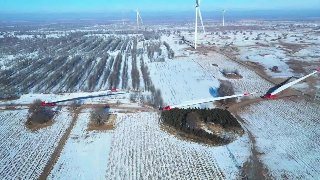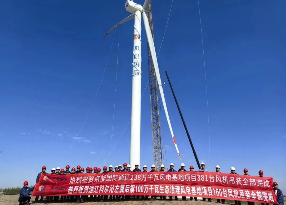 通辽 238 万千瓦风电项目在机位点分散、项目工期紧、区域跨度大、气候环境恶劣等复杂多变的情况下,全力突破施工难点堵点卡点,克服冬季严寒、大风等恶劣天气影响,全力冲刺节点目标,仅用一年时间,实现了全容量并网。创造了国内风电行业最快工期记录!