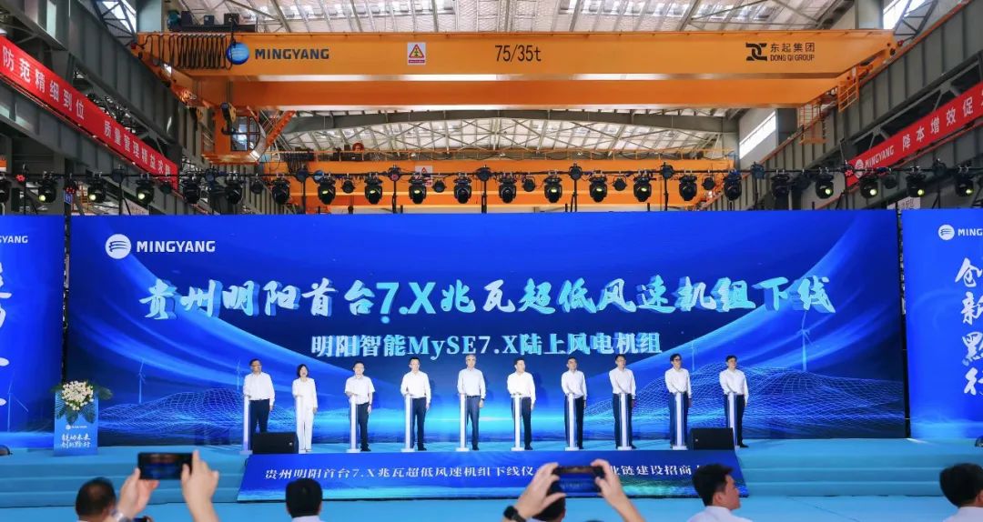 8月26日,贵州明阳首台7.X兆瓦超低风速机组下线仪式暨风电产业链建设招商大会在明阳黔东南基地举行。此次下线的MySE7.X风电机组由明阳智能自主研发,是贵州单机容量最大超低风速机组,对于推动我国大功率低风速风电技术创新、拓展贵州风能开发利用空间具有里程碑意义。该台风机也是明阳黔东南基地正式投产下线的首台风机,标志着明阳作为“链主”企业助力贵州风电产业集群建设迈出关键一步。