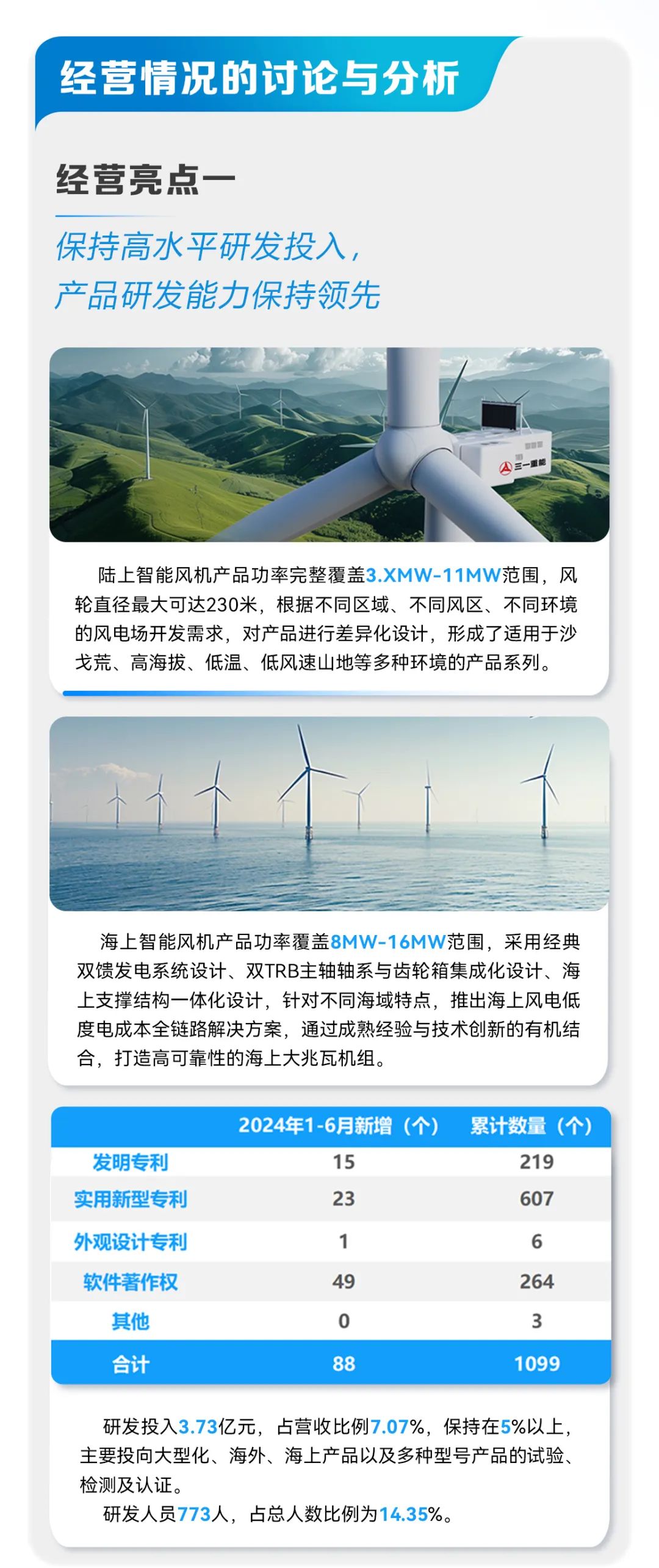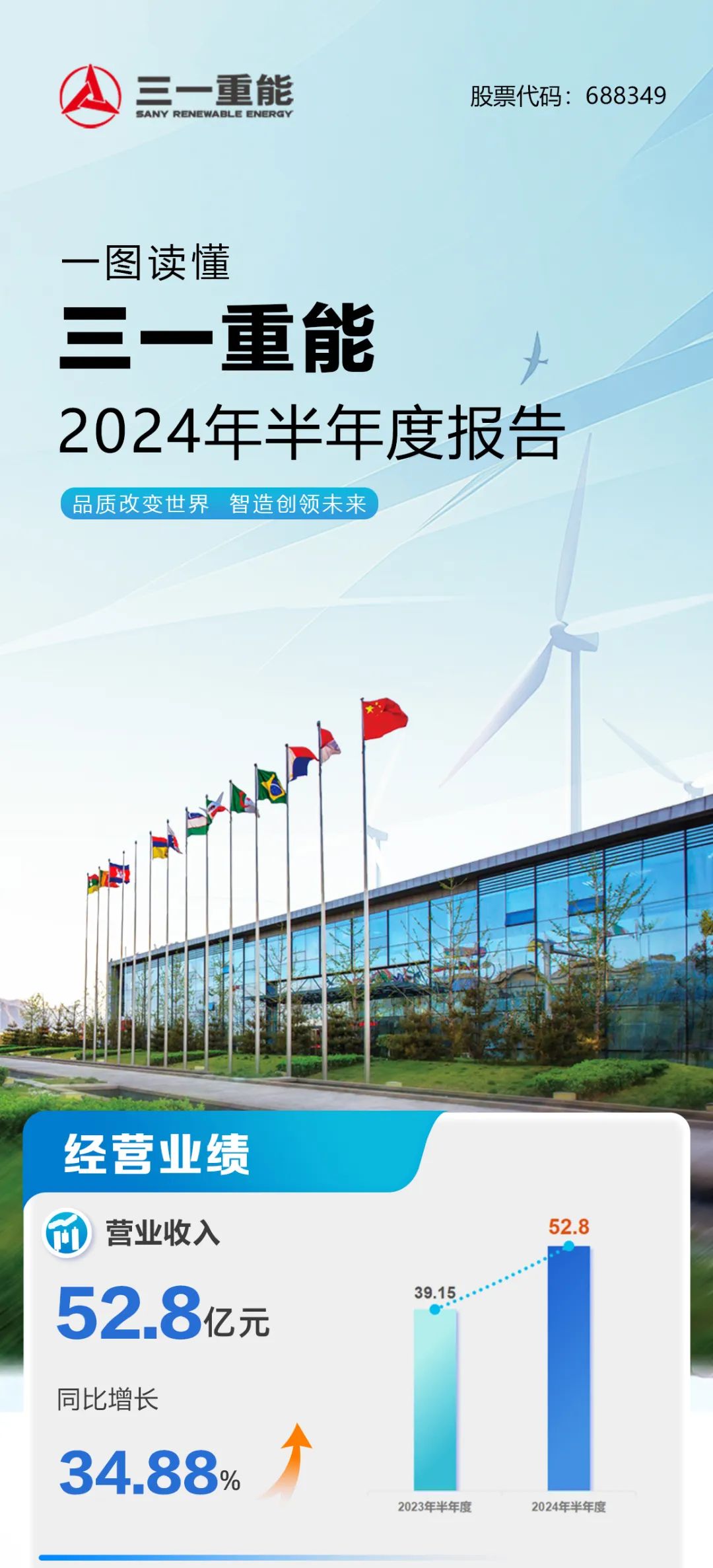 近日,三一重能发布2024年半年度报告,报告显示,据披露,三一重能上半年实现营业收入 52.80 亿元,净利润 4.34 亿元。