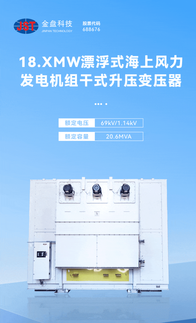 2024年8月,金盘科技自主研发配套18.XMW漂浮式海上风力发电机组的干式升压变压器成功下线,该变压器额定电压为69kV/1.14kV,额定容量为20.6MVA, 是应用于漂浮式海上风力发电机组机舱内部的目前世界上电压等级最高、容量最大的干式变压器。这一创新成果的诞生,不仅标志着金盘科技在新能源技术领域的又一次重大突破,更向世界展现了中国智能制造的科技创新实力。