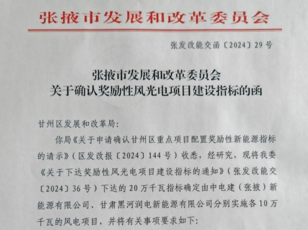 近日,张掖市发展和改革委员会正式下达《关于确认奖励性风光电项目监事指标的函》,中国电建新能源甘肃分公司凭借前瞻性的战略布局和卓越的市场竞争力,成功获取新增10万千瓦风电项目的建设指标,标志着公司在张掖市新能源市场的开拓迈出坚实而有力的一步。