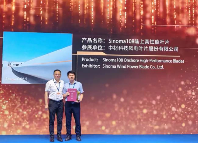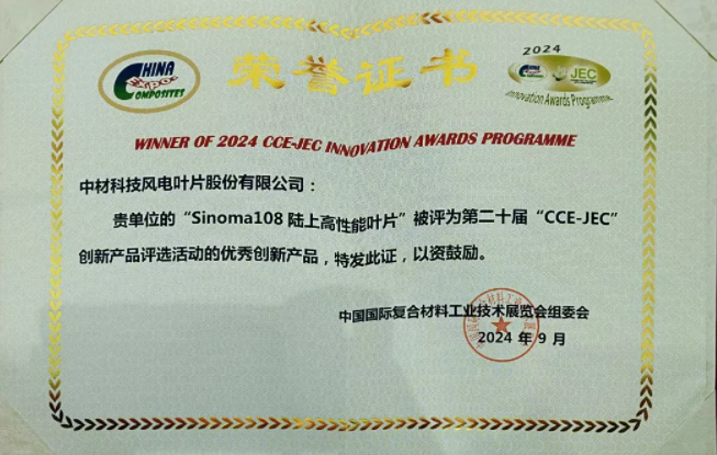 2024年9月2日,第27届中国国际复材展在国家会展中心(上海)盛大开幕。展会首日,“CCE-JEC”创新产品颁奖典礼在展区内隆重举办,经专家组评定,中材叶片Sinoma108陆上高性能叶片荣获“CCE-JEC”优秀创新产品奖。