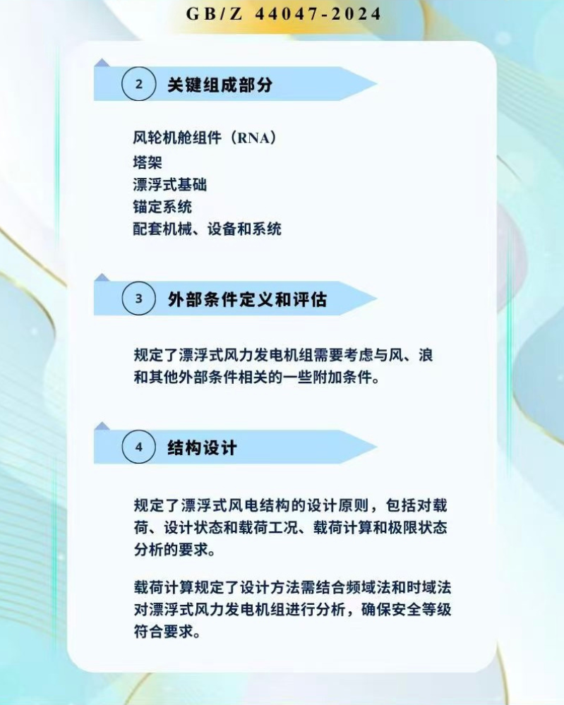 此项标准详细规定了漂浮式海上风力发电机组在设计时需要考虑的外部条件评估(不限于海洋环境、风力条件、波浪、海流等),此外,涵盖了外部条件定义和评估、结构设计、控制和保护系统、机械系统、电气系统、锚定系统等设计要求,以及如何确保漂浮式海上风力发电机组在安装、运行等状态下的稳定性和安全性。