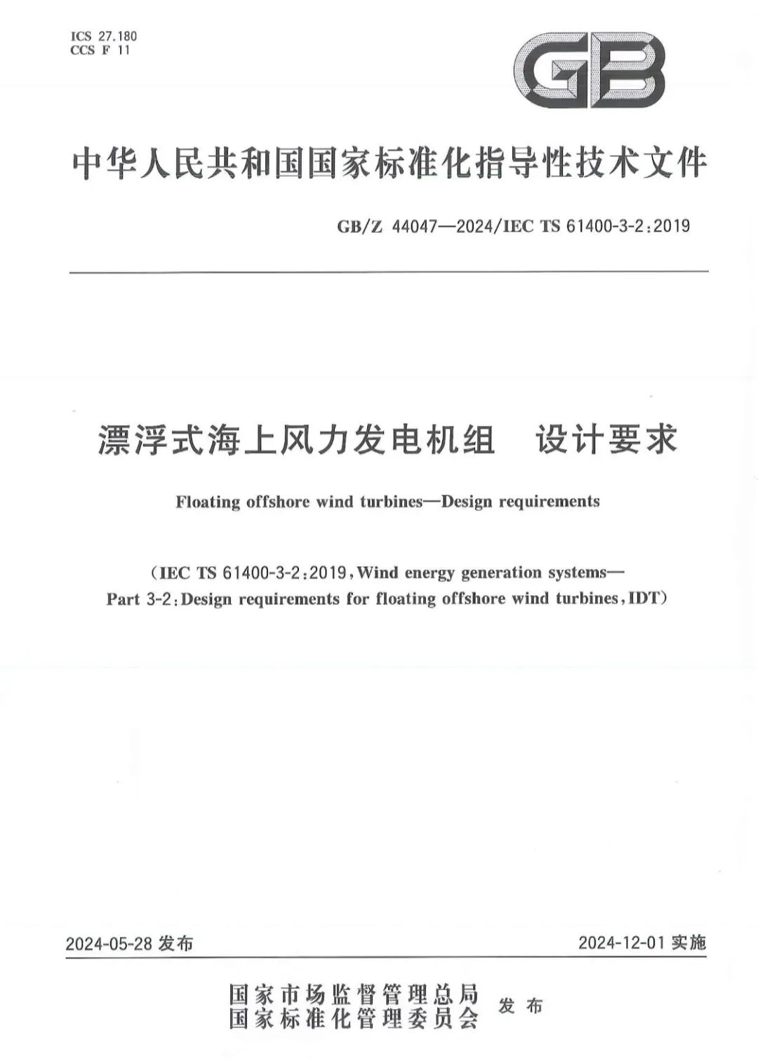 由电气风电主编的GB/Z 44047-2024《漂浮式海上风力发电机组 设计要求》(IEC TS 61400-3-2:2019 IDT)于今年5月发布,并将于2024年12月1日实施。