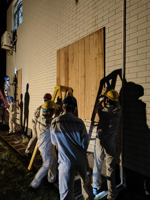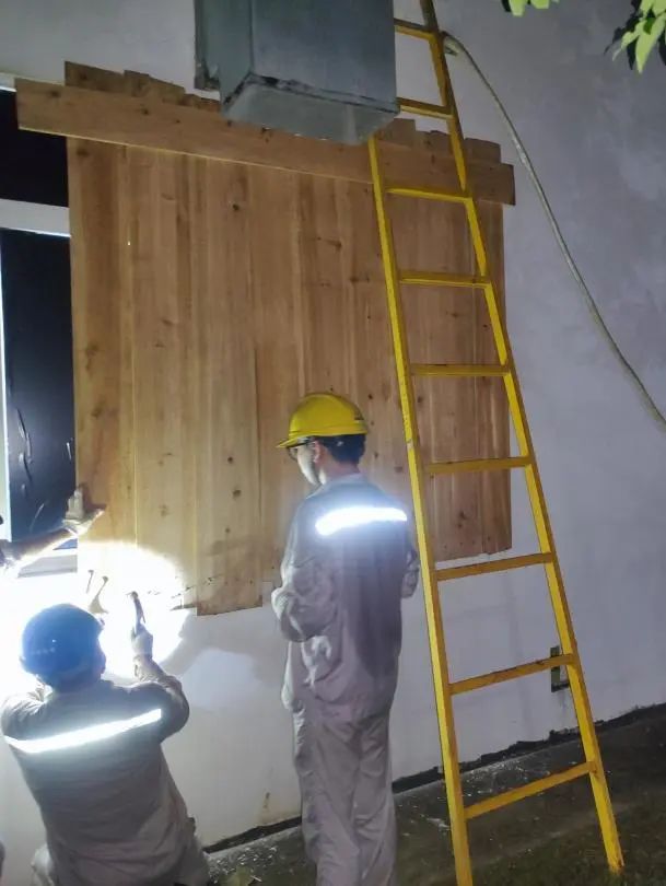 ▲9月5日晚22点,徐闻风电井仔风电场、和安风电场职工正在进行门窗加固(李锋、樊月明摄)