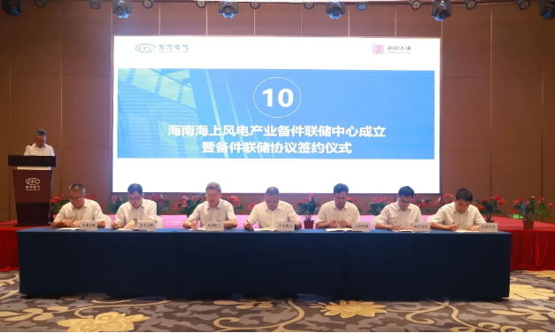 大唐海南海上风电事业部和海南洋浦海上风电产业发展有限公司主要负责人共同揭牌。双方充分发挥在能源开发、风电装备制造全产业链领域的优势,联合打造海南海上风电部件联合储备中心、大唐海上风电风机培训基地、大唐海上风电科技创新研发基地。大唐海南海上风电事业部还与东方风电、中车机电等六家主要供应商合作伙伴代表签署了《备件联储协议》,以进一步加强风电产业链上下游联动。