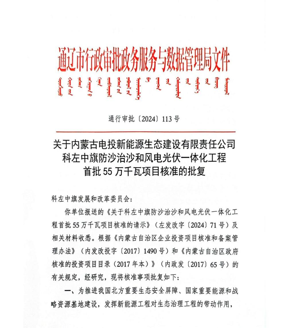 9月9日,科左中旗防沙治沙和风电光伏一体化工程首批55万千瓦项目成功核准;9月19日,扎鲁特旗防沙治沙和风电光伏一体化工程首批55万千瓦项目成功核准。至此,由通辽新能源生态建设公司承建的通辽市防沙治沙和风电光伏一体化工程首批110万千瓦项目全部完成核准。