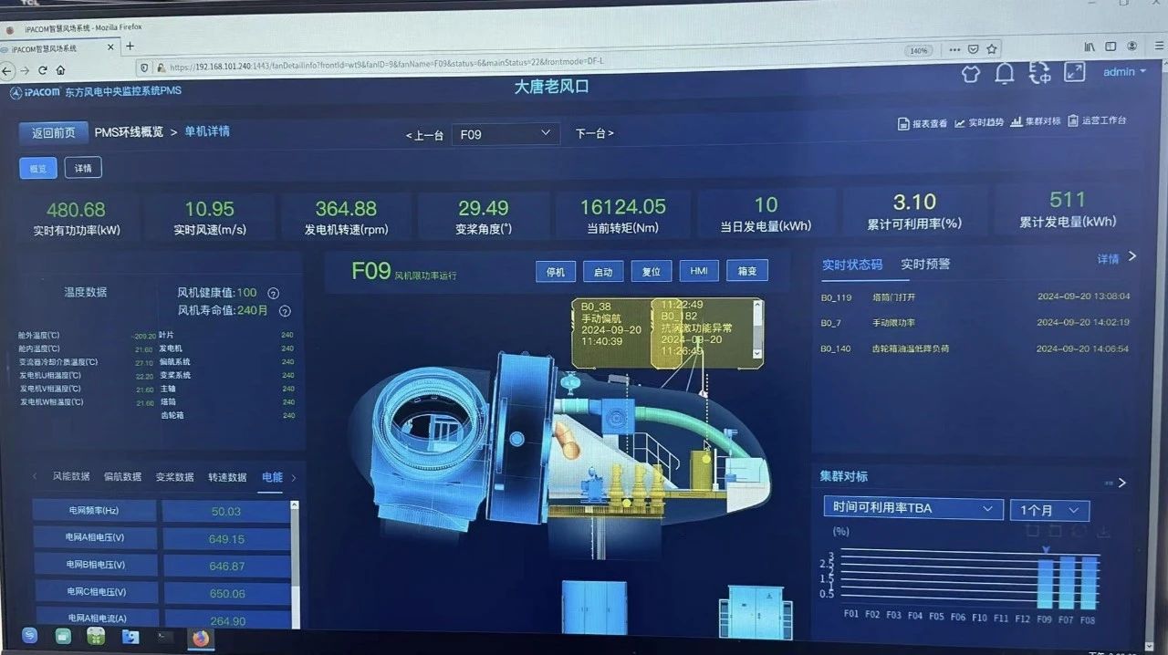2024年9月20日14时18分,随着现场总指挥一声“启动”指令下达,大唐塔城老风口项目9号风机徐徐转动中控室并网。