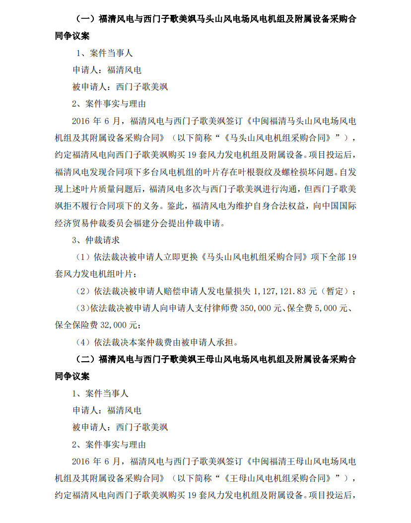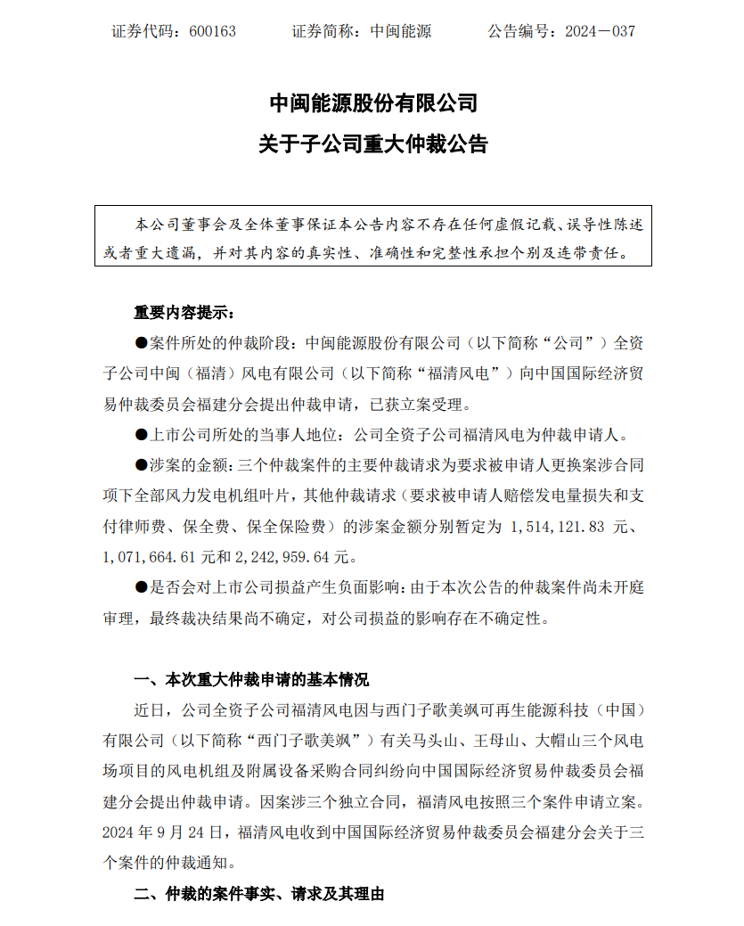 公告披露,近日,中闽能源全资子公司中闽(福清)风电有限公司(以下简称“福清风电”)因与西门子歌美飒可再生能源科技(中国)有限公司(以下简称“西门子歌美飒”)有关马头山、王母山、大帽山三个风电场项目的风电机组及附属设备采购合同纠纷向中国国际经济贸易仲裁委员会福建分会提出仲裁申请。因案涉三个独立合同,福清风电按照三个案件申请立案。2024年9月24日,福清风电收到中国国际经济贸易仲裁委员会福建分会关于三个案件的仲裁通知。