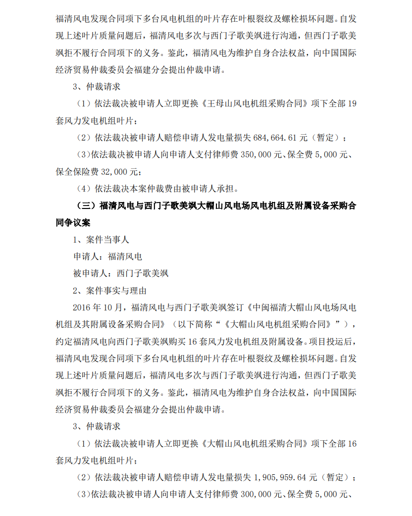 三个仲裁案件的主要仲裁请求为要求西门子歌美飒更换案涉合同项下全部风力发电机组叶片,其他仲裁请求(要求被申请人赔偿发电量损失和支付律师费、保全费、保全保险费)的涉案金额分别暂定为1,514,121.83 元、1,071,664.61元和2,242,959.64元。