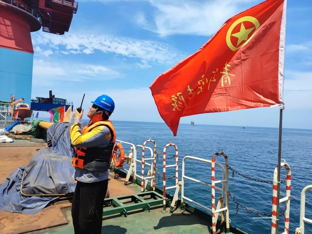 该项目以高质量党建为引领,坚持让“支部建在项目上、党旗飘在阵地上、党员冲在火线上”,通过成立党员突击队,设置“风机安装进度管理红旗责任区”,结合“青年安全生产示范岗”等活动,克服了北方地区极寒天气、用海手续办理滞后、基础形式复杂多样等难题,仅用41天完成13根钢管桩基础、2台桩-桶复合基础、6台吸力桶导管架基础、一座海上升压站基础的施工,创下了“五天五单桩”“两天两吸力桶”的施工佳绩。