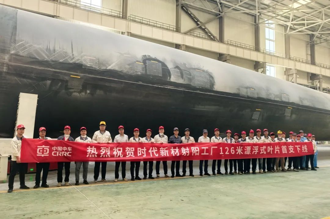 10月8日,时代新材自主研发TMT126BA漂浮式风电叶片在公司风电叶片射阳工厂顺利下线。该叶片长126米,扫风面积达53000平方米,相当于7个标准足球场。