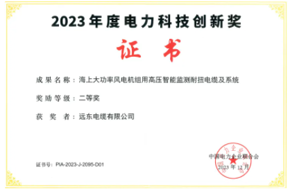今年4月,中国电力企业联合会发布2023年度电力创新奖获奖名单,远东电缆有限公司“海上大功率风电机组用高压智能监测耐扭电缆及系统”荣获2023年度电力科技创新奖。值得一提的是,远东风力发电用电缆已连续多年入选全国“制造业单项冠军”。