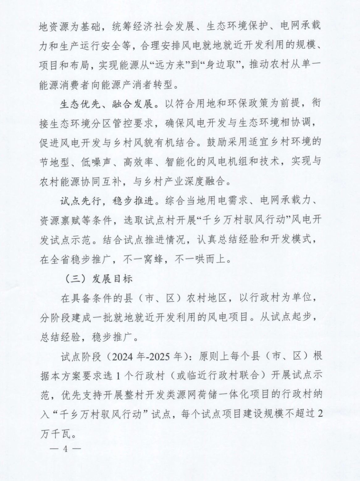 根据《总体方案》,在具备条件的县(市、区)农村地区,以行政村为单位,分阶段建成一批就地就近开发利用的风电项目。从试点起步,总结经验,稳步推广。