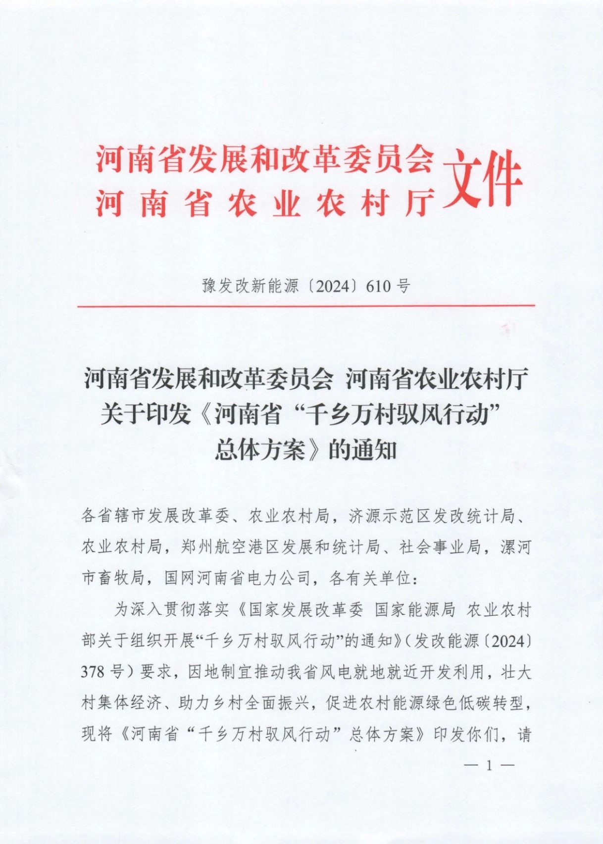 10月12日,河南省发改委、河南省农业农村厅印发《河南省“千乡万村驭风行动”总体方案》的通知。