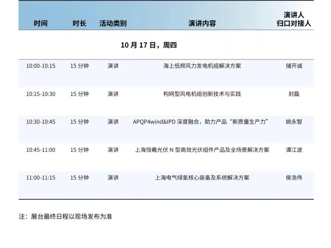 明星讲师团,精彩不断。展期内,电气风电展位有10+场展台演讲。风能展首日,现场内容涵盖大兆瓦风机设计与保护、轻量化设计与整机动力学分析,风电关键部件运维智能体,存量机组焕新升级,分散式政策解读等。