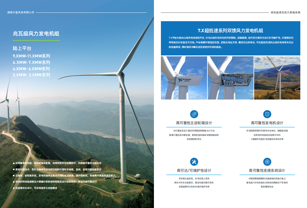 作为中国首台大兆瓦直驱和海上风电大兆瓦机组开拓者,兴蓝风电先后成功推出2MW陆上永磁直驱机组、8MW陆上风力发电机组,并率先研发并网5MW海上风力发电机组。目前,兴蓝风电已构筑起一套涵盖直驱永磁风力发电机组、全集成中速永磁风力发电机组、双馈风力发电机组技术路径三大核心战略方向的技术体系,覆盖了从陆上风电市场的20kW-500kW全系列微型风机,至2MW-11MW平台级大型陆上风力发电机组,并进一步延伸至海上风电领域,布局海上5.X-16.XMW平台系列的产品矩阵,展现了兴蓝风电在风电技术领域的深厚积淀与对市场需求的精准把握,引领公司向更加可靠、高效、智能、可持续的未来迈进。