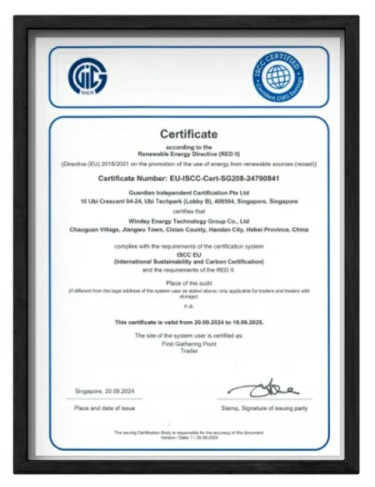 针对这一发展趋势,运达股份敏锐洞察,统筹布局,以科技创新驱动绿色能源发展,着手推动绿色甲醇产业链条建设。今年1月,运达股份河北邯郸绿色甲醇制备示范区项目成功签约,以“风电机组—绿电—绿氢—绿醇”全产业链的形式打造邯郸新能源国际创新港,引领行业率先垂范。凭借科研领域的不懈攻关,运达股份邯郸绿色甲醇项目于日前喜获中国首张以农场/种植园为原点的绿色甲醇原料端国际可持续性和碳认证(简称ISCC EU)证书,不仅为公司后续的绿色甲醇产品认证工作提供了有力的技术支撑,更为中国绿色航运的脱碳转型提供了极富价值的参考路径。目前,运达股份在原料种植、收集处理、甲醇生产加工、原料与产品运输、仓储和贸易等关键环节均实现了绿色减排设计,预计每干吨船用燃料(绿色甲醇)的减排量将显著超越欧盟“可再生能源指令(RED II)”和“Fuel EU Maritime”法规的碳减排标准。