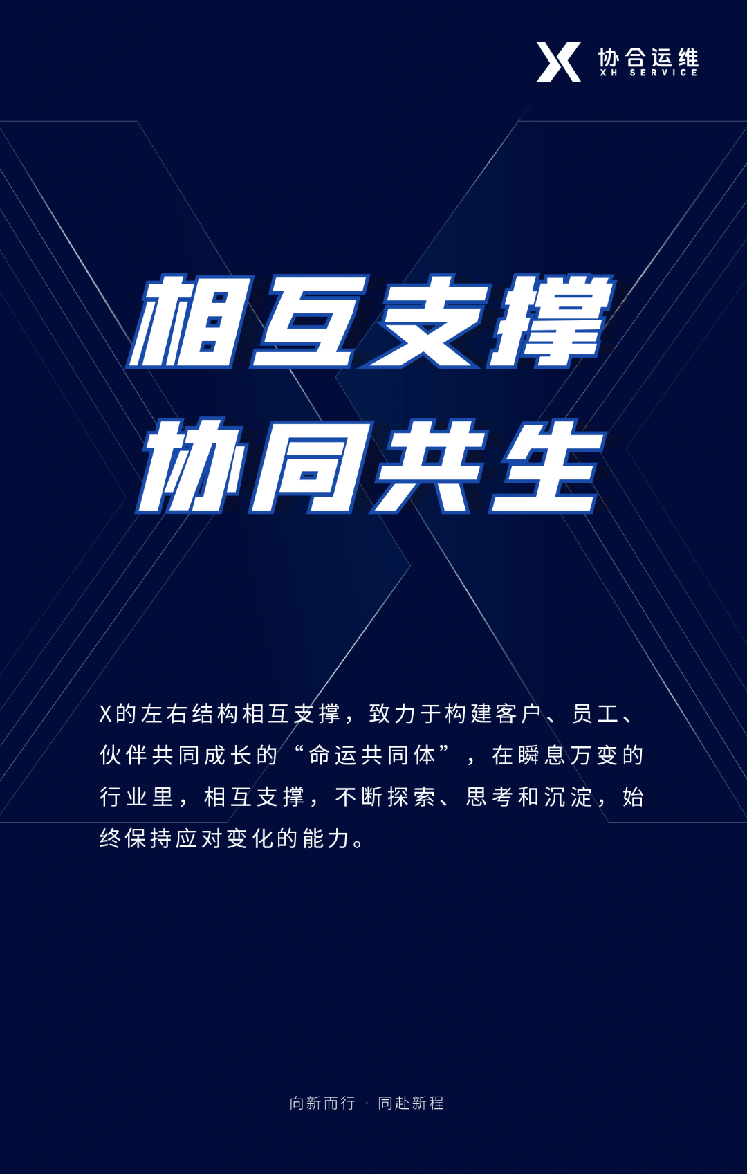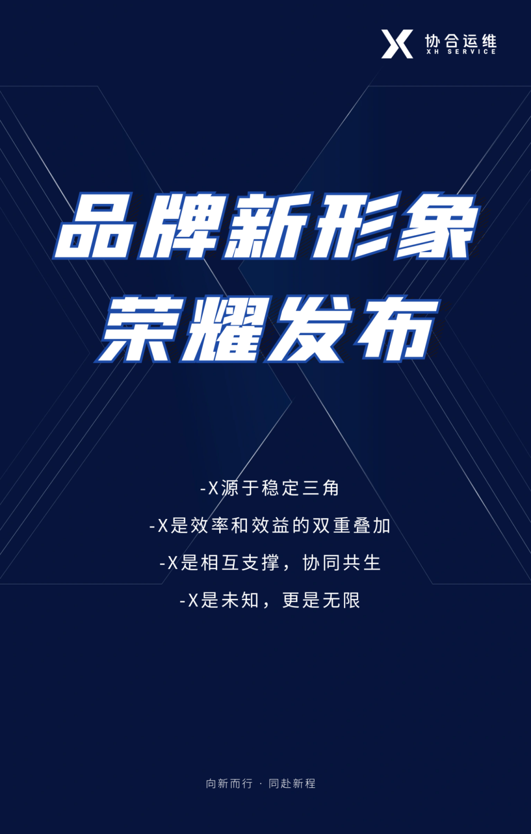 Logo是品牌精神的凝练和显性化。新logo取形于X造型,喻意稳固可靠、效率倍增、协同共生、无限未来。