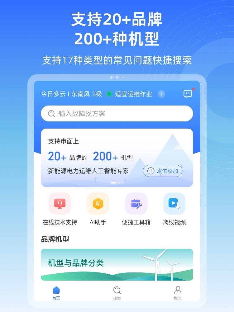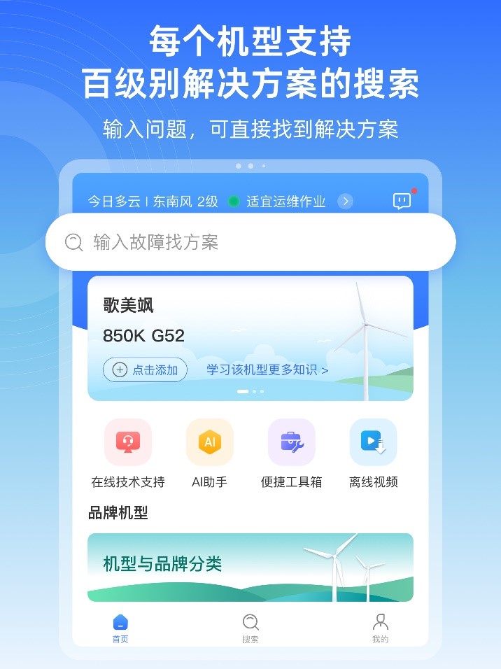 “风运通”App定位为风电运维人员的随身助手和学习伙伴,它囊括20多个风机品牌、200多种机型的2万+故障解决方案,为用户提供快速、准确的故障处理指南,同时搭载“AI作业助手”功能,实现作业准备、故障处理、作业总结全流程高效便捷。