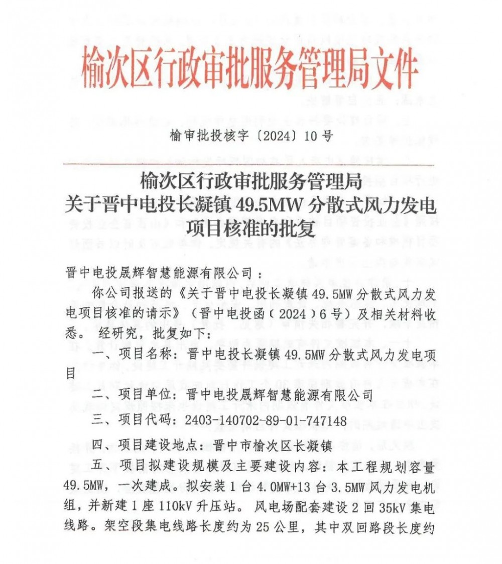 山西新能源公司榆次49.5MW分散式风电项目获得核准