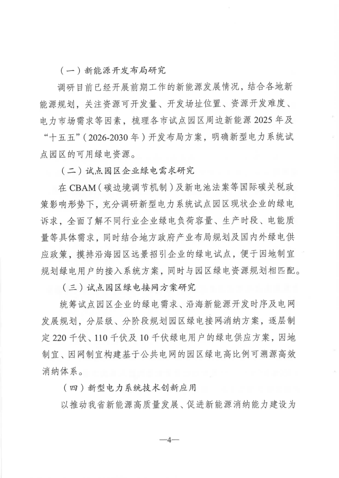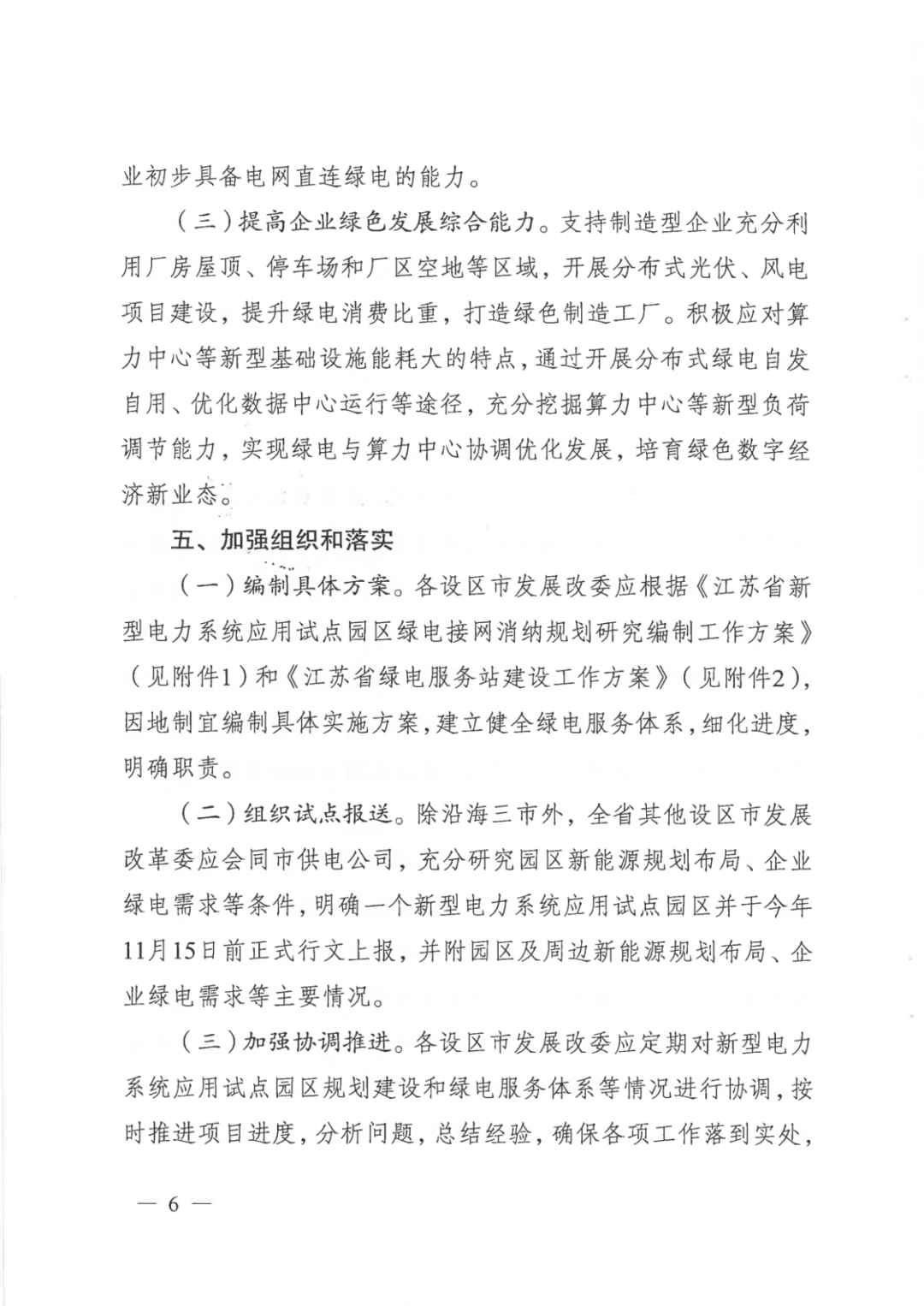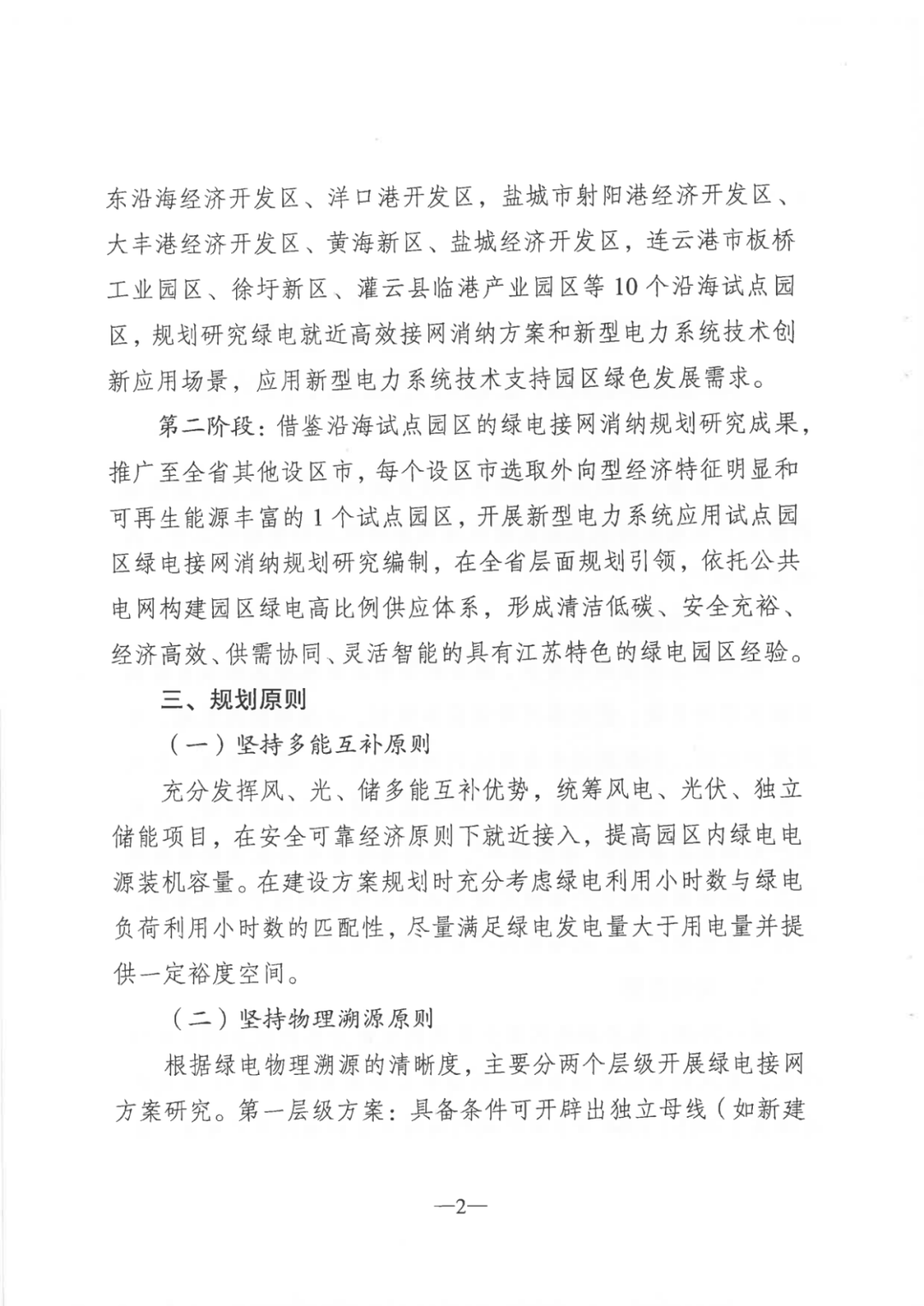 根据沿海和苏南地区试点园区的规划建设经验,在江苏省其余设区市推广应用,每个设区市可推荐一个新型电力系统试点园区,结合当地及周边新能源发展、产业发展、外贸需求等情况,开展新型电力系统试点园区规划研究,于2025年6月组织编制完成《新型电力系统试点园区绿电接网消纳规划研究报告》,将园区附近的陆上光伏、风电就近、就地、就低接入电网,建设源荷适配的网架结构,完善分层、分时调度机制,提升园区整体自管理、自平衡、自调节能力,支撑新能源就地平衡消纳。到2027年,力争江苏省绿电就近接入园区的电网输配消纳能力新增约1000万千瓦。
