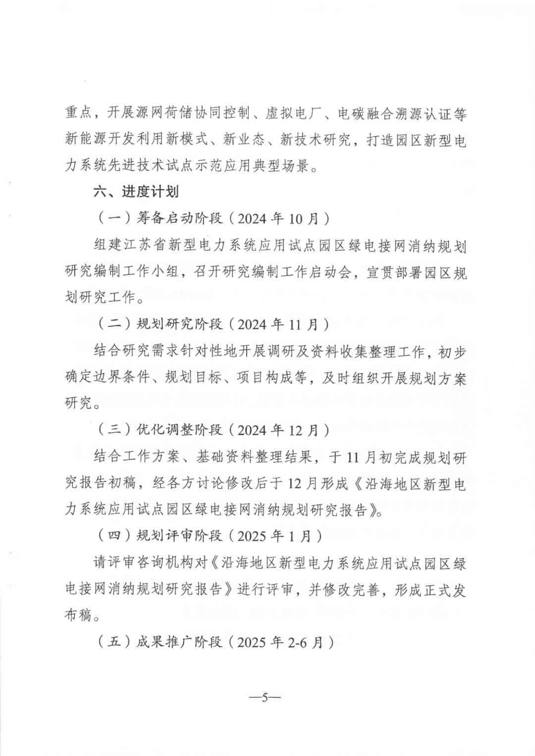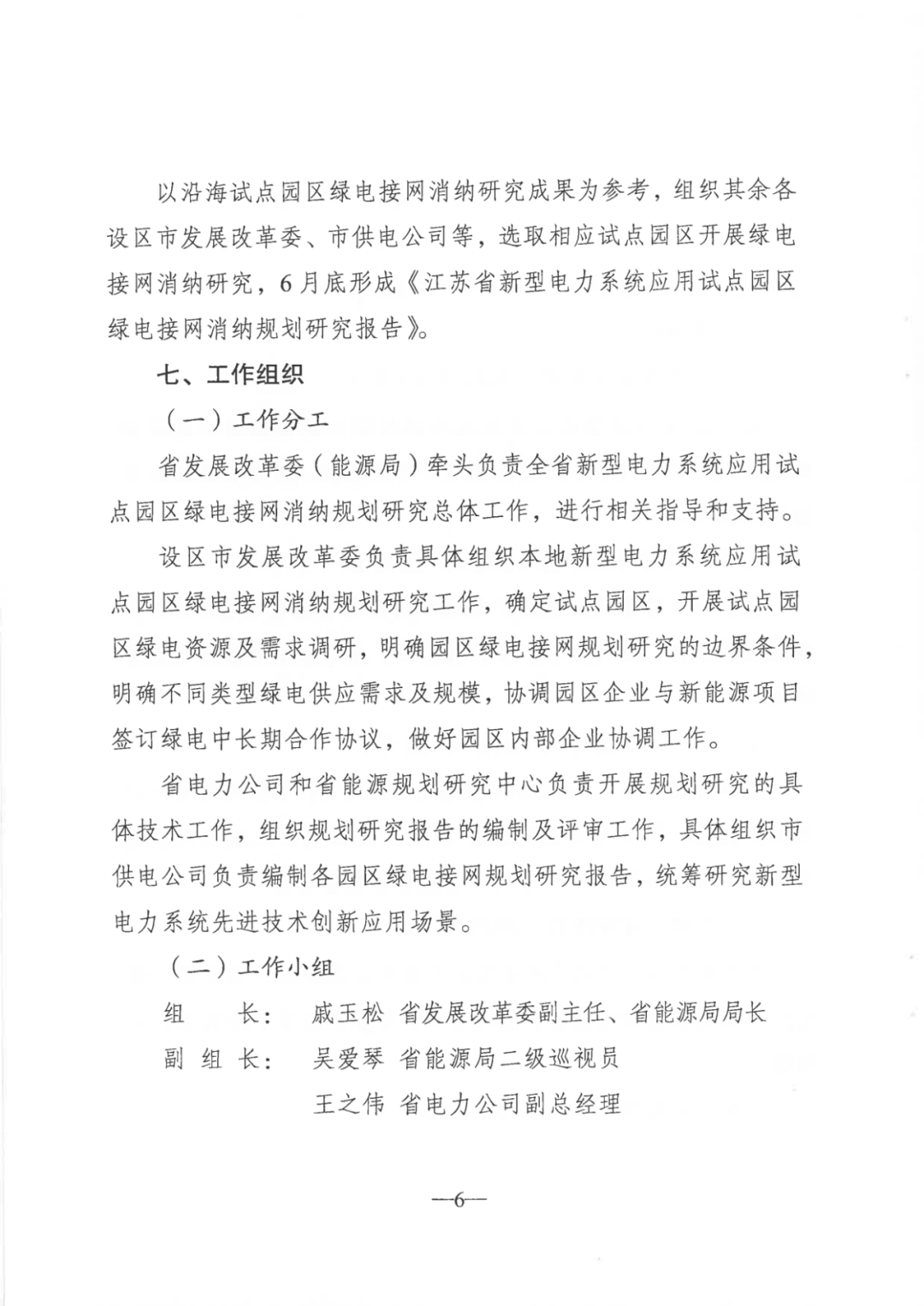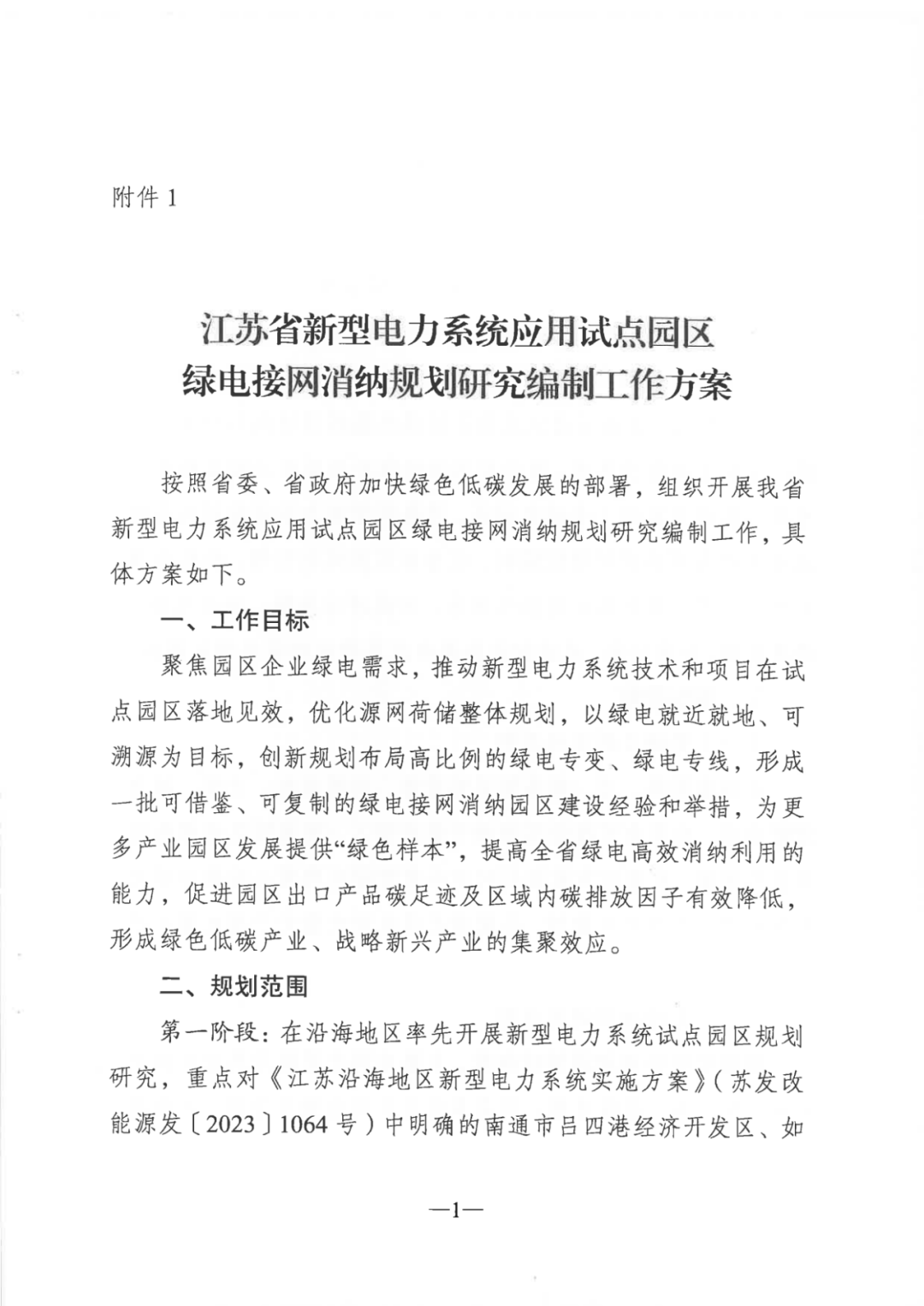 根据沿海和苏南地区试点园区的规划建设经验,在江苏省其余设区市推广应用,每个设区市可推荐一个新型电力系统试点园区,结合当地及周边新能源发展、产业发展、外贸需求等情况,开展新型电力系统试点园区规划研究,于2025年6月组织编制完成《新型电力系统试点园区绿电接网消纳规划研究报告》,将园区附近的陆上光伏、风电就近、就地、就低接入电网,建设源荷适配的网架结构,完善分层、分时调度机制,提升园区整体自管理、自平衡、自调节能力,支撑新能源就地平衡消纳。到2027年,力争江苏省绿电就近接入园区的电网输配消纳能力新增约1000万千瓦。