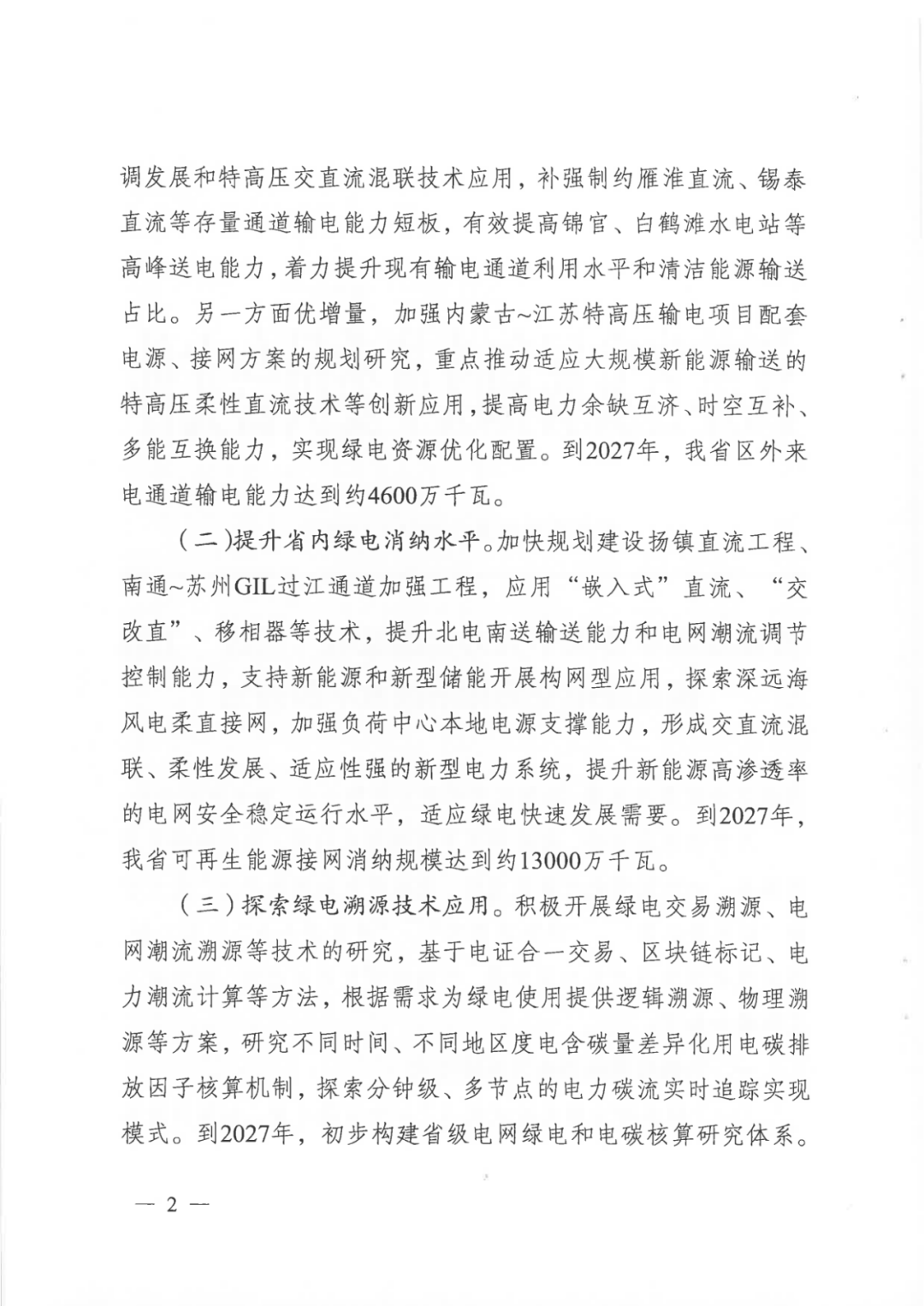《通知》指出,提高跨省绿电输送能力。重点推动适应大规模新能源输送的特高压柔性直流技术等创新应用,提高电力余缺互济、时空互补多能互换能力,实现绿电资源优化配置。到2027年,江苏省区外来电通道输电能力达到约4600万千瓦。