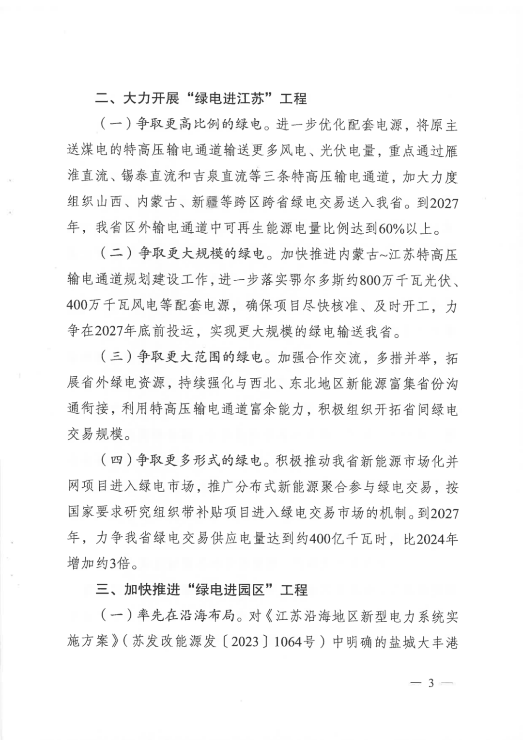 大力开展“绿电进江苏”工程。争取更高比例的绿电。进一步优化配套电源,将原主送煤电的特高压输电通道输送更多风电、光伏电量,重点通过雁淮直流、锡泰直流和吉泉直流等三条特高压输电通道,加大力度组织山西、内蒙古、新疆等跨区跨省绿电交易送入江苏省。到2027年,江苏省区外输电通道中可再生能源电量比例达到60%以上。