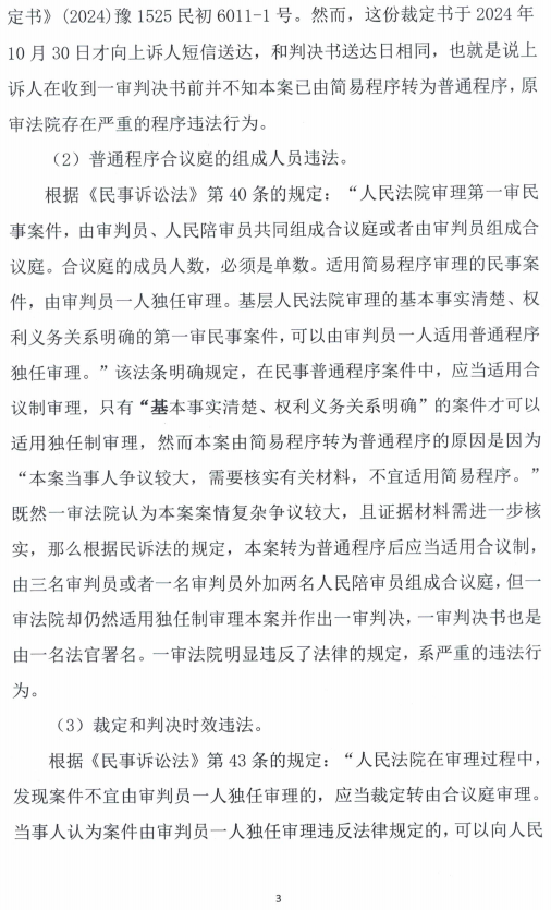 3.转为普通程序后,依据固始县人民法院认为的“本案当事人争议较大,需要核实有关材料”,本案应由三名审判员或者一名审判员外加两名人民陪审员组成合议庭,但固始县人民法院却仍然适用独任制审理本案并作出一审判决,判决书也是由一名法官署名,这明显违反了法律的规定,所以普通程序合议庭的组成人员也存在违法行为。