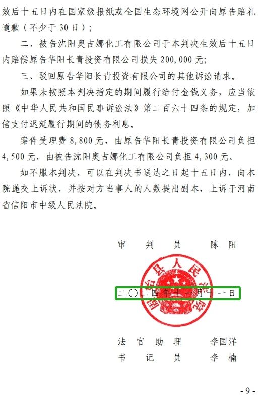 “一、被告沈阳奥吉娜化工有限公司立即停止对原告华阳长青投资有限公司的举报、投诉等名誉侵权行为,并于本判决生效后十五日内在国家级报纸或全国生态环境网公开向原告赔礼道歉(不少于 30 日);