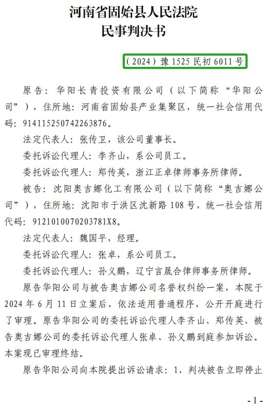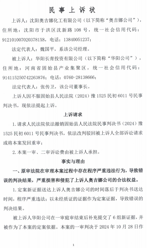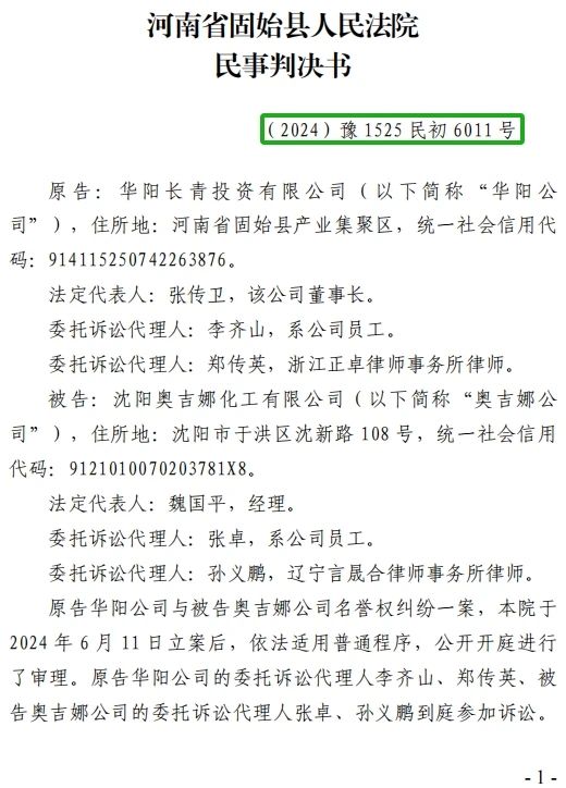 河南华阳长青起诉沈阳奥吉娜举报案名誉侵权一审判胜诉奥吉娜指证一审程序明目张胆严重违法上诉