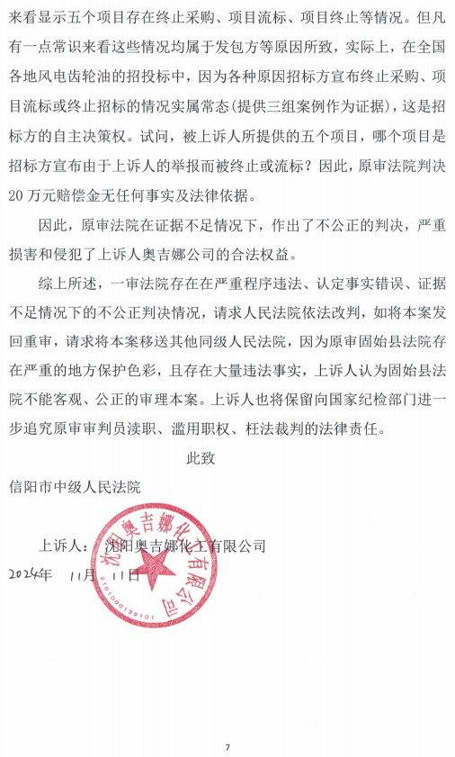 5、2024年10月30日,奥吉娜公司收到固始县法院日期为2024年10月28日的民事判决书(2024)豫 1525 民初 6011 号。奥吉娜公司不服判决,于2024年11月11日向一审法院递交上诉状,同时,对法官陈阳的严重违法行为向人大、纪监委进行检举。