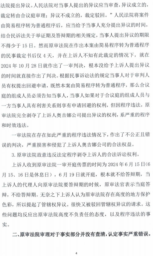 奥吉娜公司判定固始县法院的一审判决和裁定存在肆无忌惮的程序严重违法行为,判决内容也与奥吉娜公司举报不符,于2024年11月11日向一审法院递交上诉状,指证: