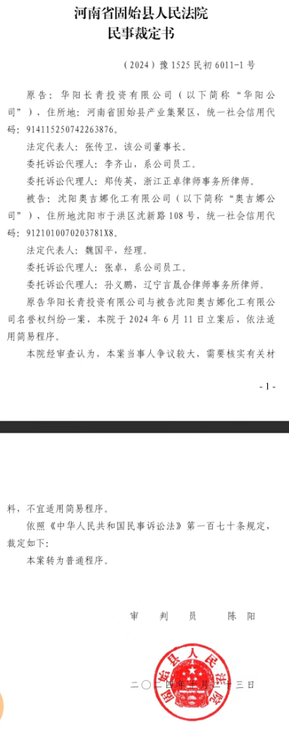 2024年8月14日,固始县法院开庭审理。2024年10月30日,奥吉娜公司收到2024年10月28日的《民事判决书》(2024)豫 1525 民初 6011号((后附《判决书》),同时还收到该案由简易程序转为普通程序、日期为2024年10月23日的《民事裁定书》(2024)豫1525民初6011-1号(后附《裁定书》)。判决长青公司胜诉如下:
