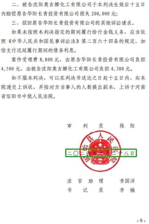 案件受理费8,800元,由原告华阳长青投资有限公司负担4,500元,由被告沈阳奥吉娜化工有限公司负担4,300元。”