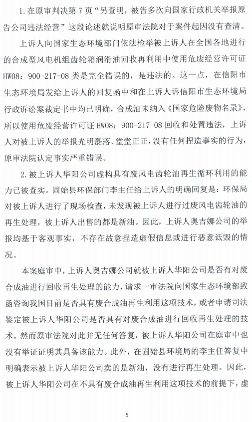 因发现华阳长青投资有限公司(下称:长青公司。位于河南省信阳市固始县)在多家央企风电润滑油招投标过程中,违法使用只适用于废矿物油回收处置的《危险废物经营许可证》HW08:900-217-08,回收处置废合成型风力发电机组齿轮油(下称:废风电齿轮油)问题,沈阳奥吉娜化工有限公司(下称:奥吉娜公司)自2022年10月18日起,多次向国家生态环境部及直属部门进行实名举报。因不接受信阳市生态环境局固始分局的多次答复和信阳市生态环境局的调查处理结论,奥吉娜公司遂以不作为和乱作为为由,起诉信阳市生态环境局(长青公司为第三人),经过固始县法院的一审、信阳市中级法院的二审、以及河南省高级法院的三审,均以奥吉娜公司为“不适格原告”(用白话讲,就是没有起诉资格)为由,裁定驳回起诉、上诉和申诉。